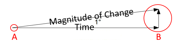 In the illustration above, you see that at the time a one-degree change begins (point A) the magnitude of its effect seems very small. But as time goes on, the magnitude grows (point B), even though it is still just one degree of change.