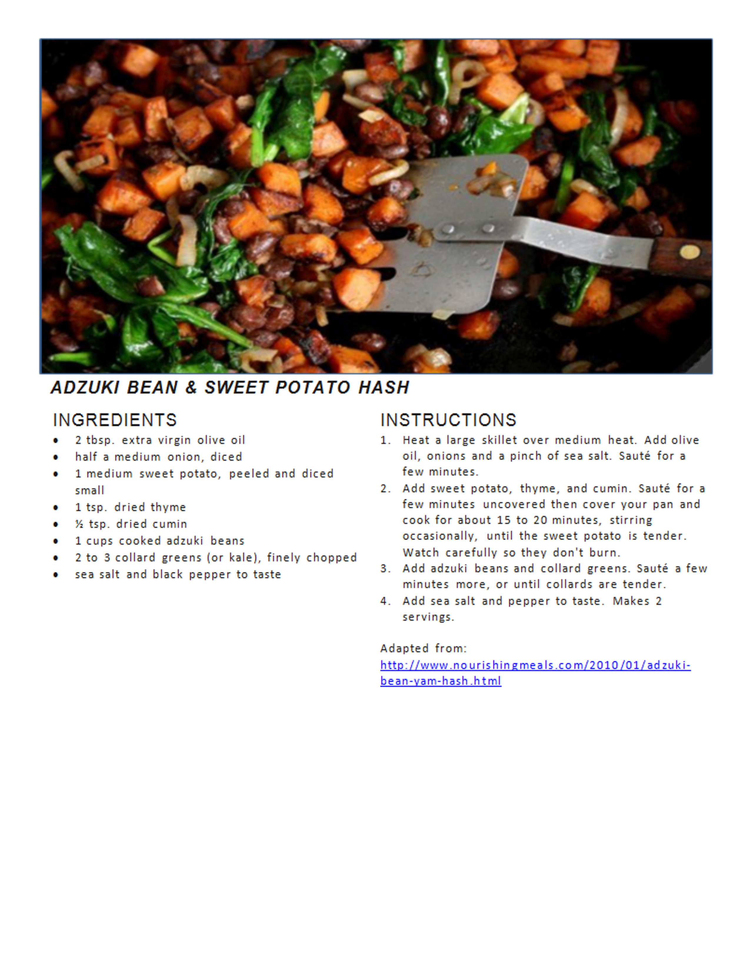 Recipes Adzuki Bean and Sweet Potato Hash Posted by Janet McKenzie, ND on May 11, 2018May 17, 2018 sweet potato, adzuki beans, collard greens, onion Related
