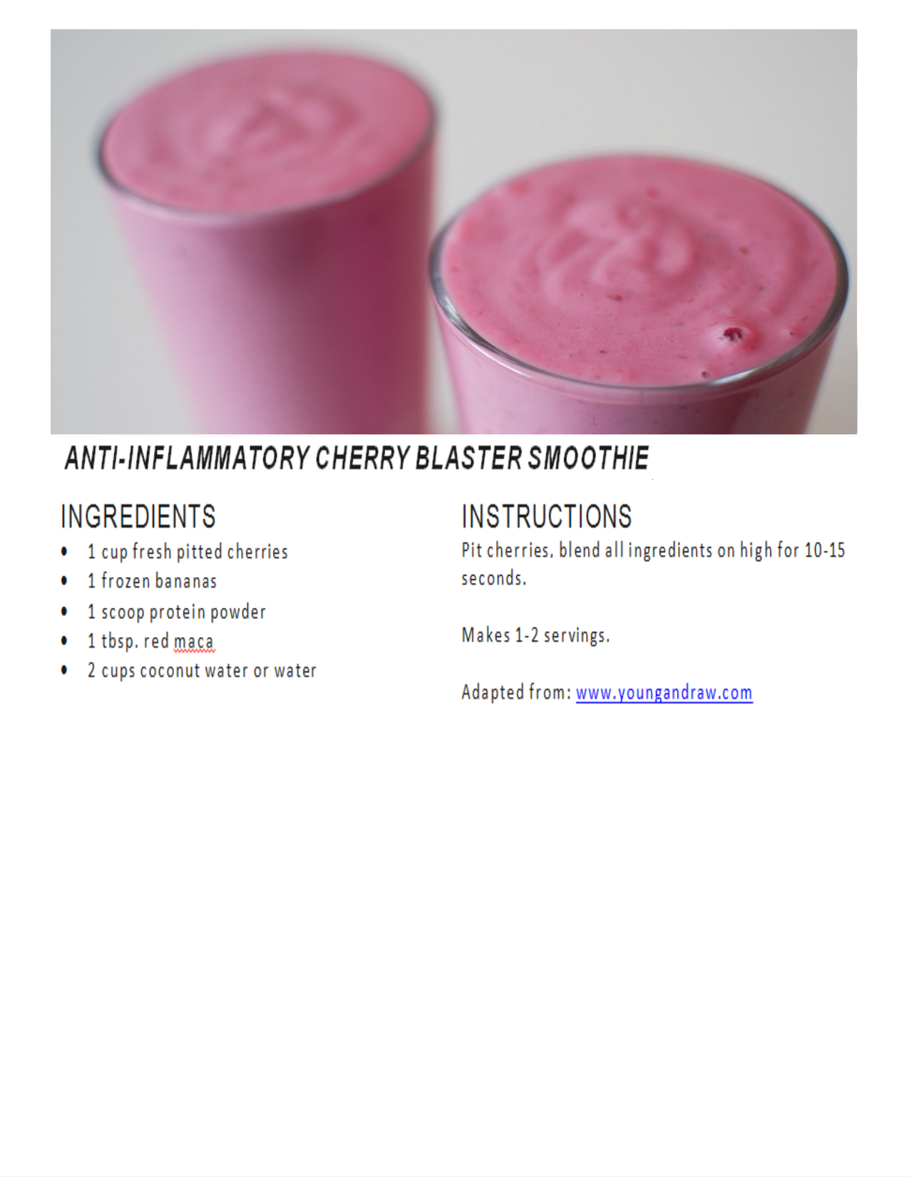 Recipes Anti-Inflammatory Cherry Blaster Smoothie Posted by Janet McKenzie, ND on May 11, 2018May 17, 2018 cherries banana coconut water maca Related