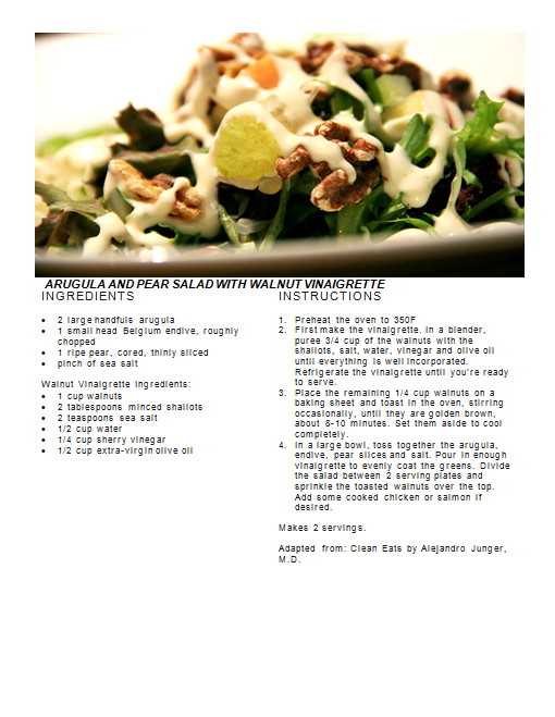 Recipes Arugula and Pear Salad with Walnut Vinaigrette Posted by Janet McKenzie, ND on May 14, 2018June 14, 2018 arugula, pears, walnuts, endive Related