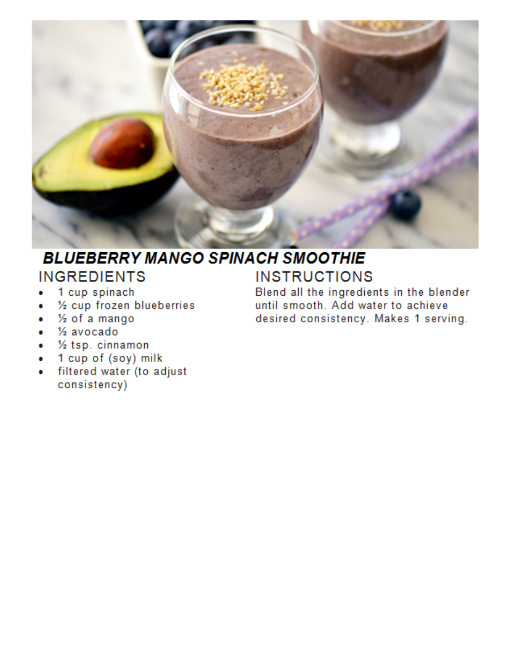 Recipes Blueberry Mango Spinach Smoothie Posted by Janet McKenzie, ND on May 15, 2018June 14, 2018 blueberries, mango, spinach, avocado Related