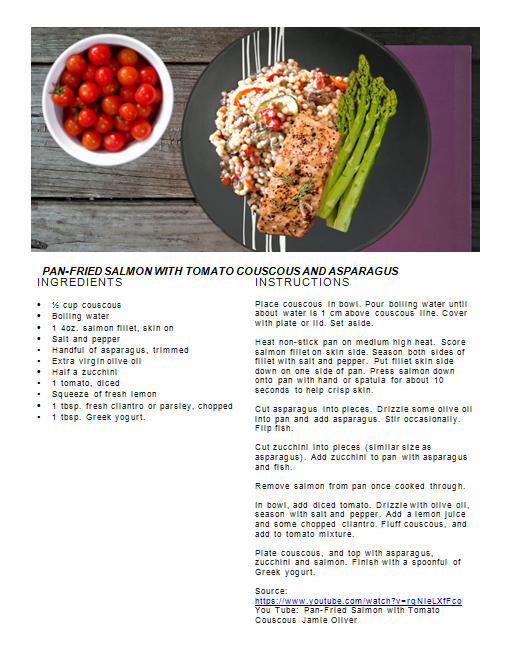 Recipes Pan-Fried Salmon with Tomato Couscous and Asparagus Posted by Janet McKenzie, ND on May 24, 2018June 13, 2018 couscous, asparagus, cherry tomatoes, salmon, zucchini Related