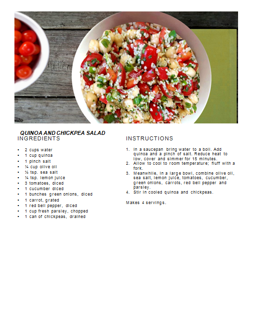 Recipes Quinoa and Chickpea Salad Posted by Janet McKenzie, ND on May 24, 2018June 13, 2018 quinoa, chickpeas, cucumber, tomatoes, green onion, carrots, red pepper Related