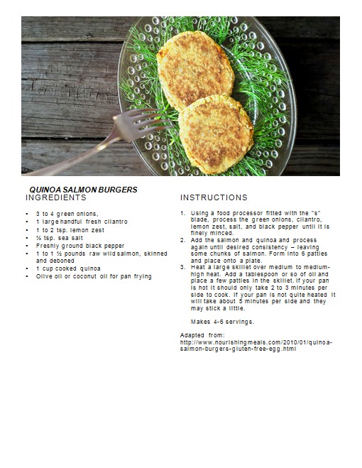 Recipes Quinoa Salmon Burgers Posted by Janet McKenzie, ND on May 25, 2018June 13, 2018 salmon, quinoa, green onions, lemon zest, celantro Related