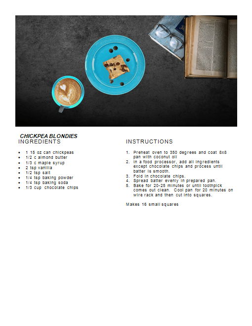 About Natural Medicine, Recipes Chickpea Blondies Posted by Janet McKenzie, ND on June 5, 2018June 13, 2018 chickpeas, almond butter, maple syrup, chocolate chips Related