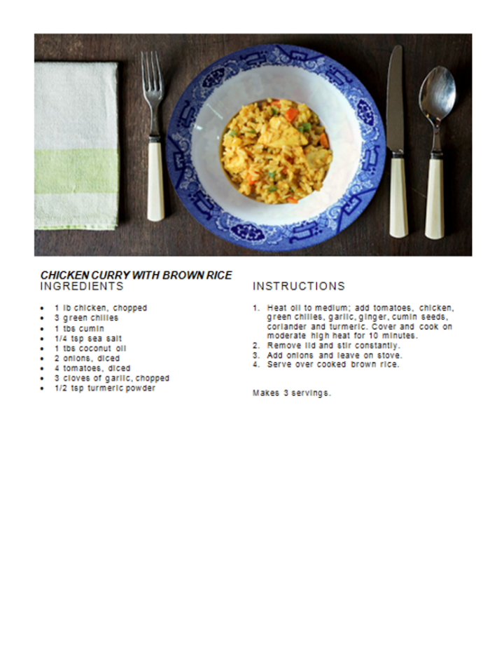 Recipes Chicken Curry with Brown Rice Posted by Janet McKenzie, ND on June 19, 2018 chicken, tomatoes, chilies, garlic, turmeric Related