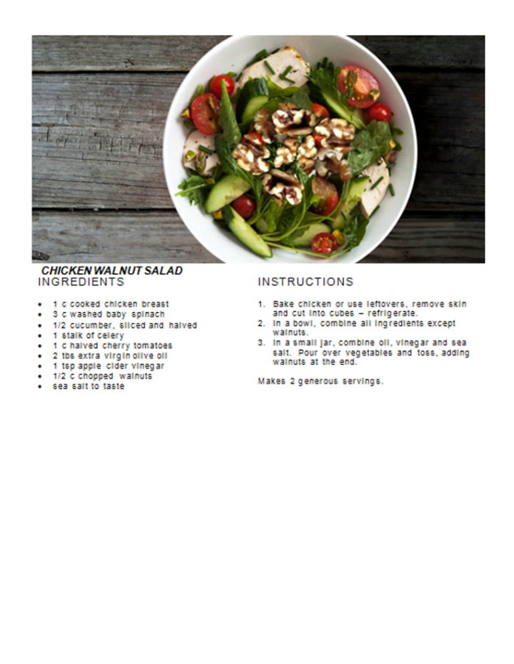 Recipes Chicken Walnut Salad Posted by Janet McKenzie, ND on June 20, 2018 chicken, spinach, tomatoes, cucumber, walnuts Related