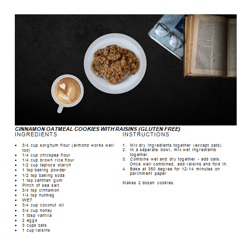 Coconut oil is a great souce of medium-chain triglycerides (fats) which are believed to promote fat burning and raise good cholesterol levels in the blood. Cinnamon stabilizes blood sugar and raisins are an excellent source of potassium, a mineral needed for heart function. Even cookies can be nutritious!