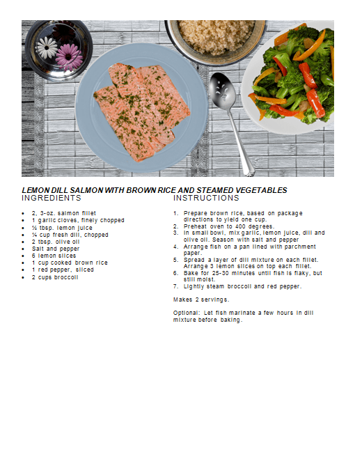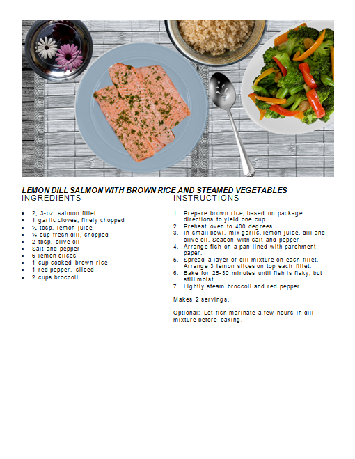 Recipes Lemon Dill Salmon with Brown Rice and Steamed Vegetables Posted by Janet McKenzie, ND on July 13, 2018 salmon fillets, lemon, dill, olive oil, brown rice, broccoli, bell peppers Related