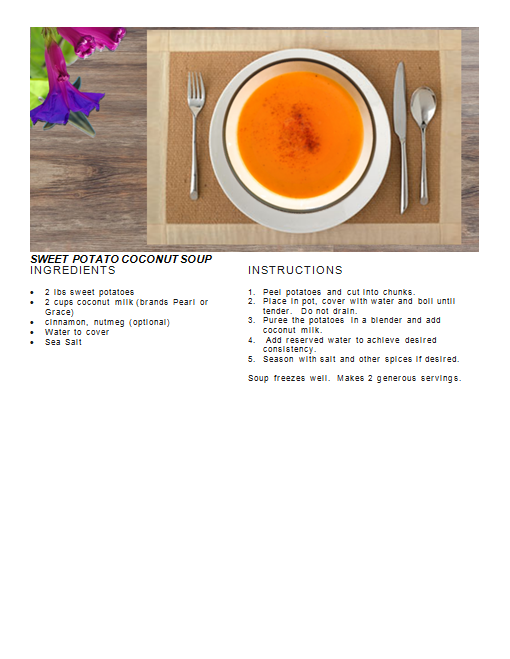 Recipes Sweet Potato Coconut Soup Posted by Janet McKenzie, ND on July 13, 2018July 13, 2018 sweet potatoes, coconut milk, cinnamon, nutmeg Related