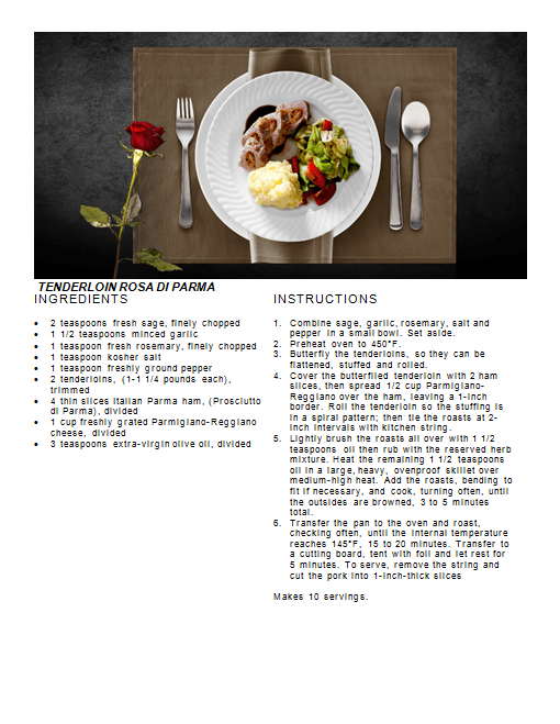 Recipes Tenderloin Rosa di Parma Posted by Janet McKenzie, ND on July 18, 2018July 18, 2018 beef or pork tenderloin, Parma ham, (Prosciutto di Parma), freshly grated Parmigiano-Reggiano Related