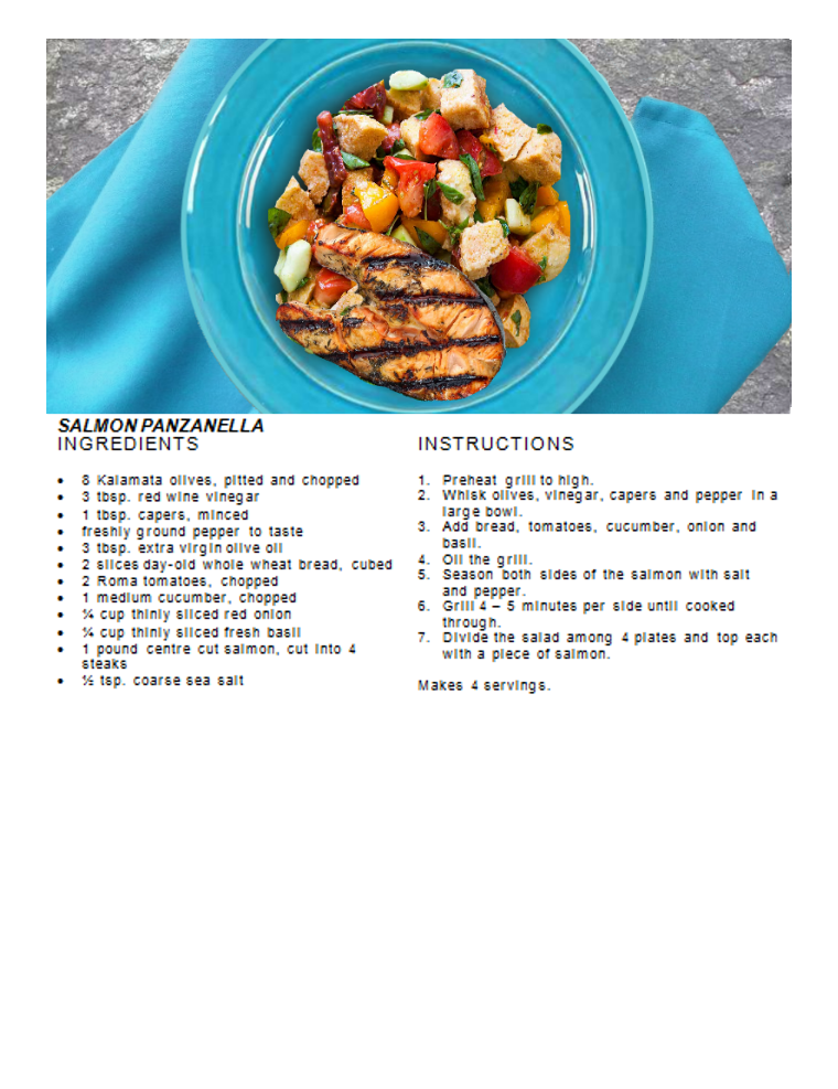 Recipes Salmon Panzanella Posted by Janet McKenzie, ND on July 19, 2018 salmon, olives, cucumber, tomatoes, whole wheat bread Related