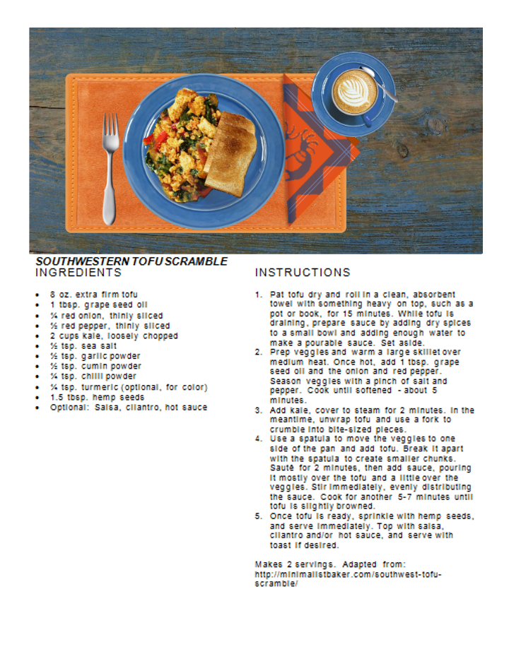 Recipes Southwestern Tofu Scramble Posted by Janet McKenzie, ND on July 20, 2018 tofu, kale, onions, pepper, hemp seeds Related