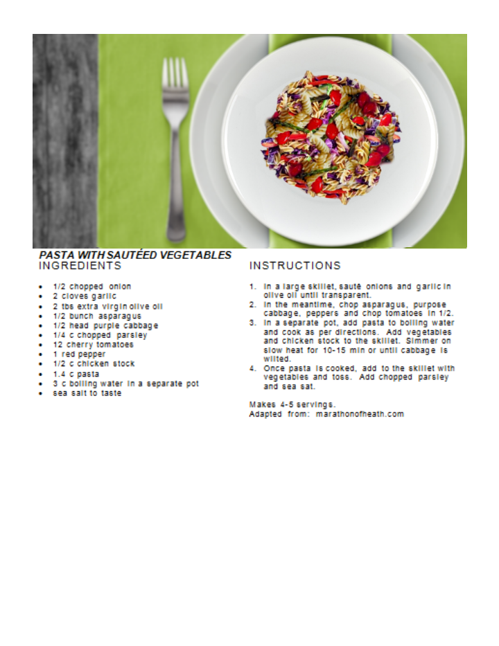 Recipes Pasta with Sautéed Vegetables Posted by Janet McKenzie, ND on July 23, 2018 pasta, purple cabbage, asparagus, cherry tomatoes Related