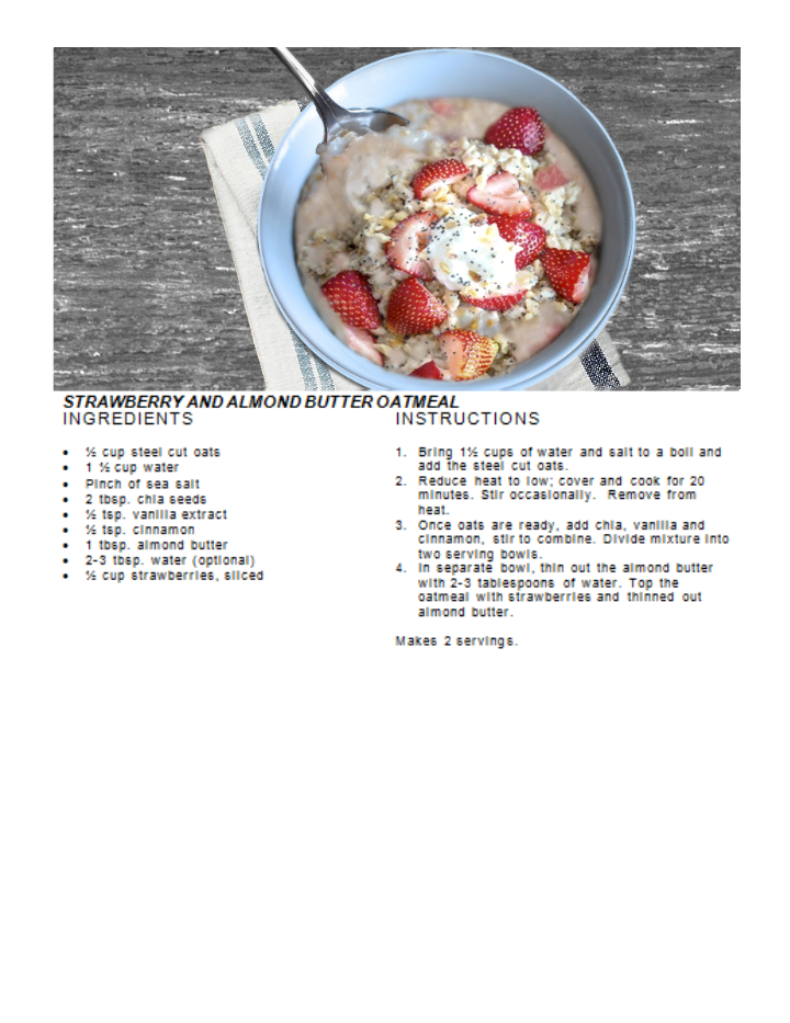 Recipes Strawberry & Almond Butter Oatmeal Posted by Janet McKenzie, ND on July 23, 2018 steel cut oats, chia seeds, almond butter, strawberries Related