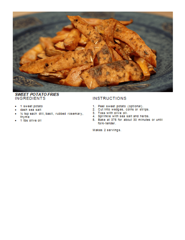 Recipes Sweet Potato Fries Posted by Janet McKenzie, ND on July 24, 2018 sweet potatoes, olive oil, sea salt, mixed herbs Related