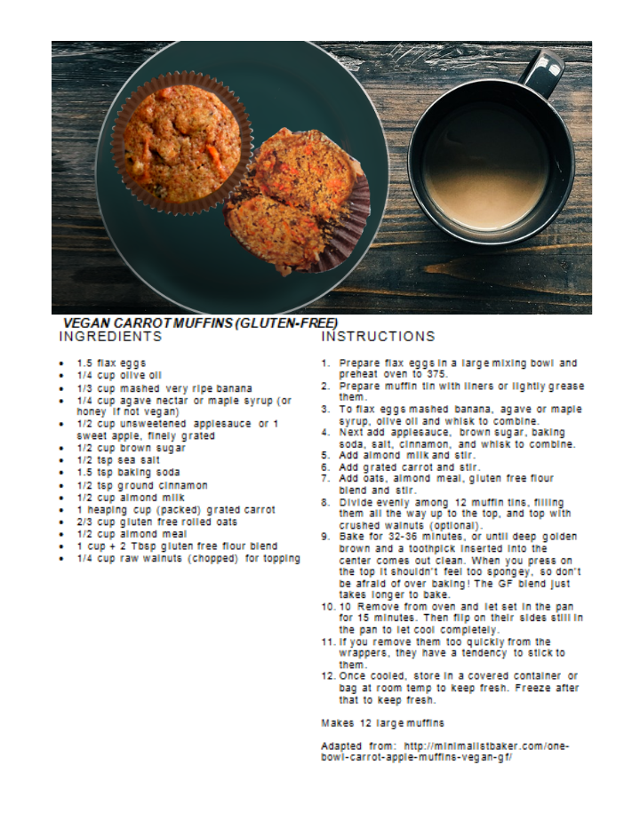 Recipes Vegan Carrot Muffins (Gluten-Free) Posted by Janet McKenzie, ND on July 25, 2018 banana, maple syrup, carrots, rolled oats, flax eggs, walnuts Related