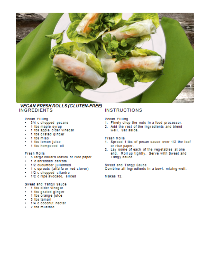 Recipes Vegan Fresh Rolls (Gluten-Free) Posted by Janet McKenzie, ND on July 26, 2018August 17, 2018 Even if you are not vegan or gluten-sensitive, these Thai-inspired fresh rolls are sure to be a new favourite. Ingredients: avocado, pecans, cucumber, carrots Related